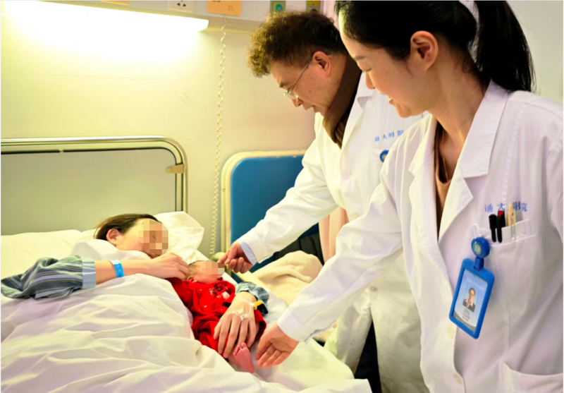 其中一名,就是产房里的这位年轻妈妈。多年来,小儿外科的医务人员一直与患者家庭保持联系,半年前,当怀孕的消息传来,一家人第一时间选择回到通大附院生产,将这份沉甸甸的信任再次托付给医院。